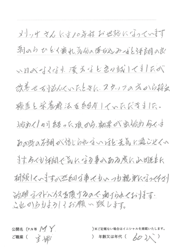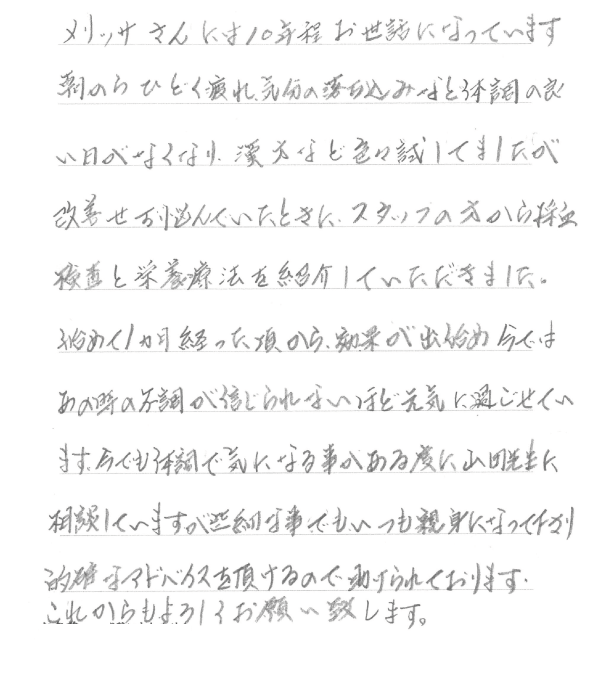 メリッサさんには10年程お世話になっています。朝からひどく疲れ、気分の落ち込みなど体調の良い日がなくなり、漢方など色々試してましたが改善せず悩んでいたときに、スタッフの方から採血検査と栄養療法を紹介していただきました。始めて1ヵ月経った頃から、効果が出始め今ではあの時の不調が信じられないほど元気に過ごせています。今でも体調で気になる事がある度に、山田先生に相談していますが些細な事でもいつも親身になって下さり的確なアドバイスを頂けるので助けられています。これからもよろしくお願い致します。