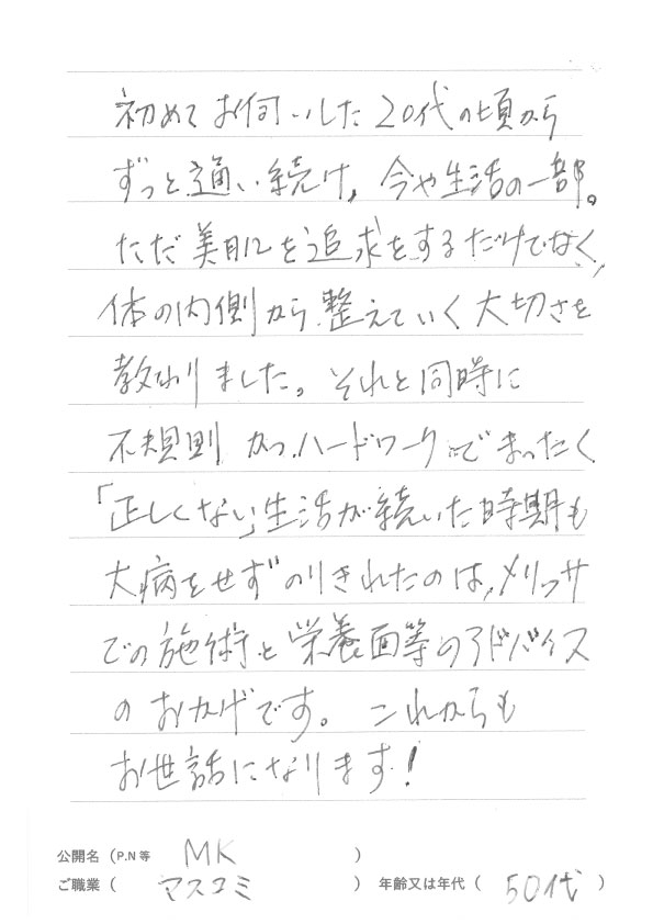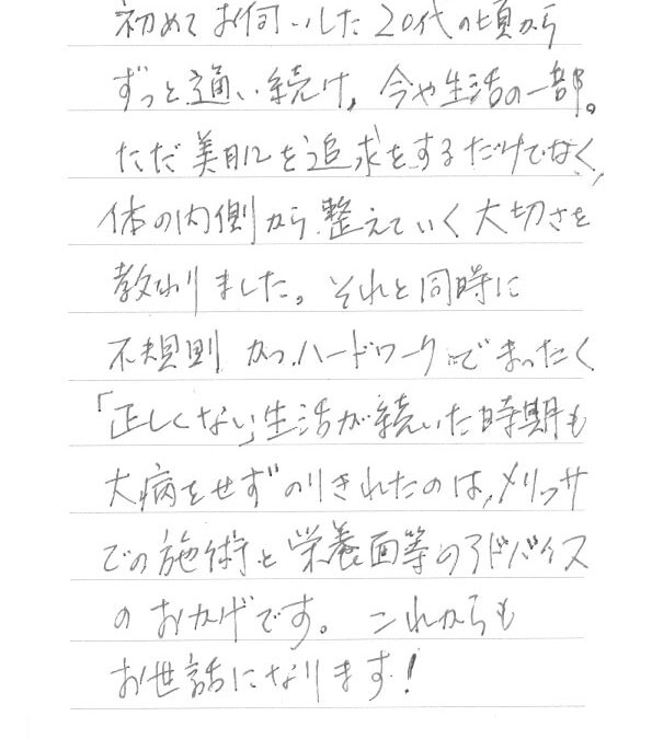 ただ美肌を追求するだけでなく、体の内側から整えていく大切さを教わりました。それと同時に不規則かつハードワークでまったく「正しくない」生活が続いた時期も大病をせずのりきれたのは、メリッサでの施術と栄養面等でのアドバイスのおかげです。